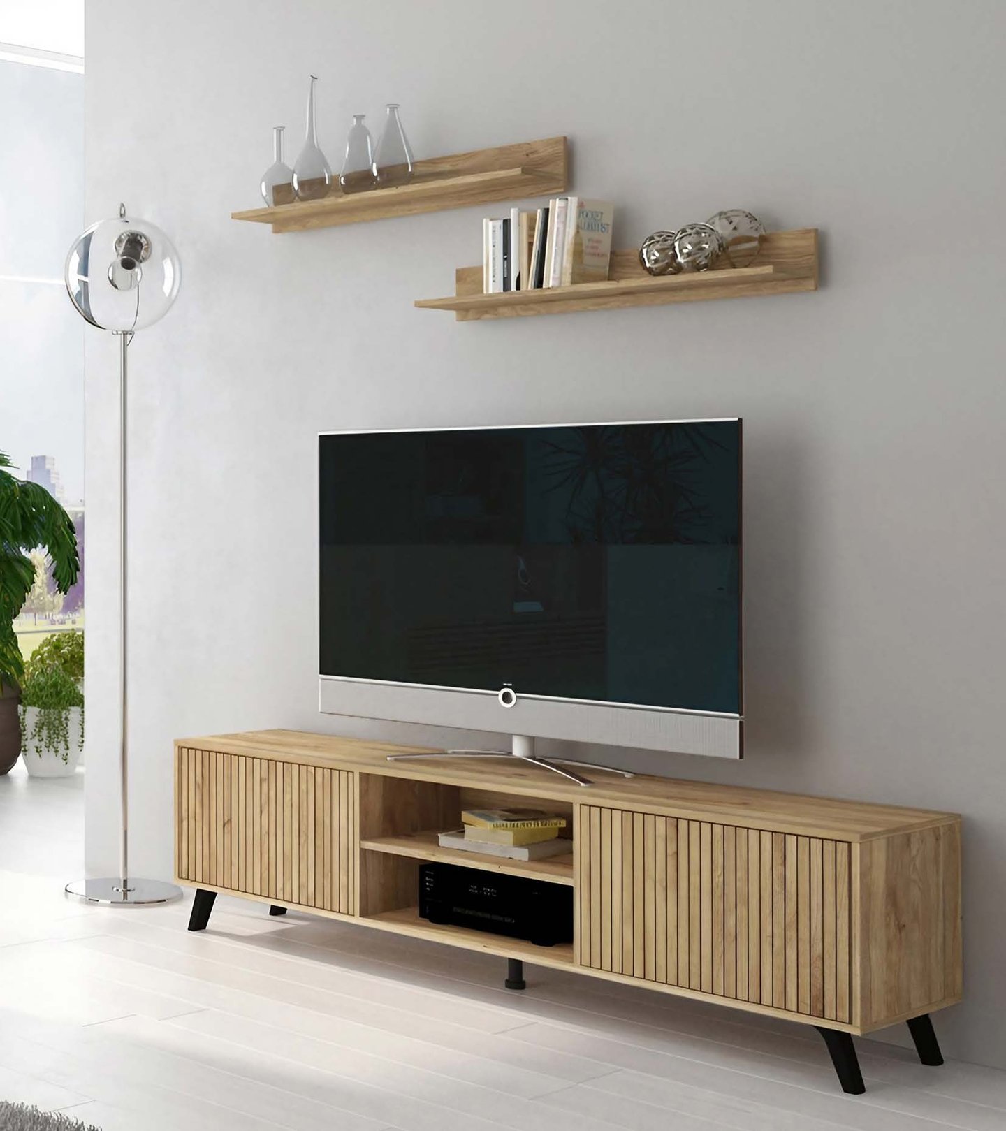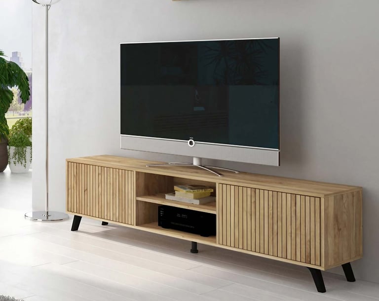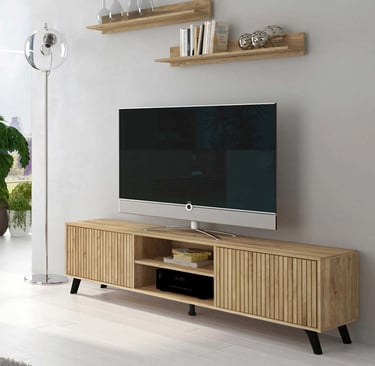 Bajo de televisión de 180cm, con dos estantes abiertos y dos módulos cerrados de fácil abertura.